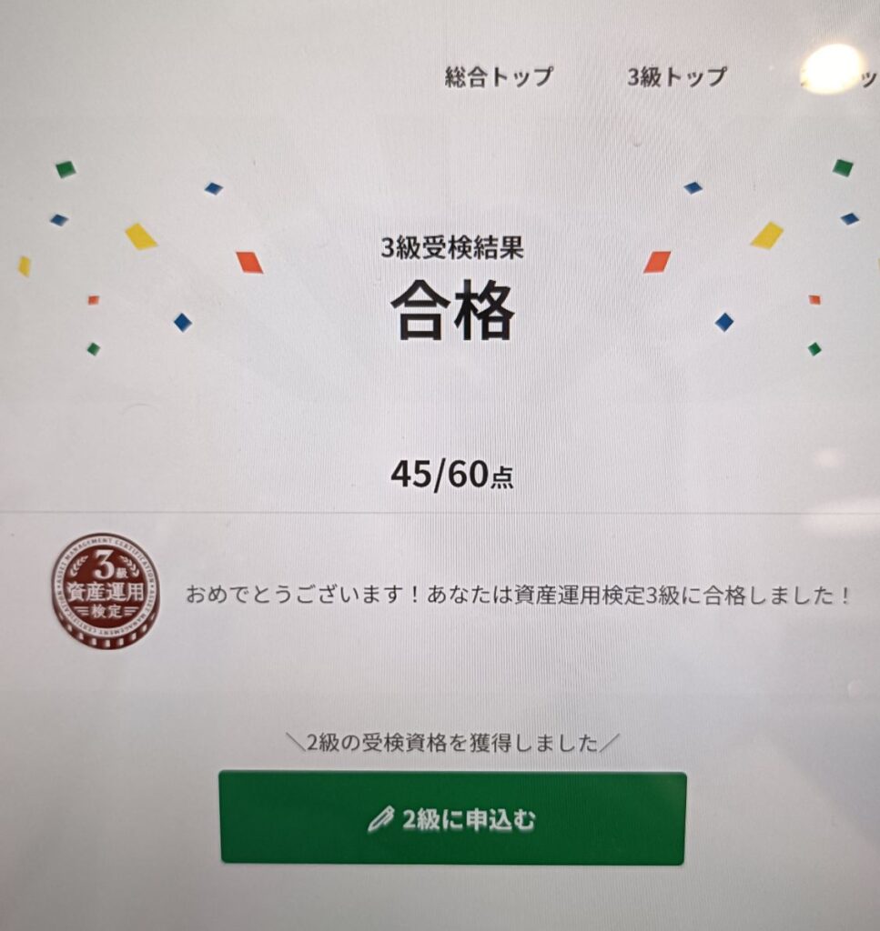 現在は3級の上には資産運用2級(個人投資家レベル)があります。3級の合格率は高めですが、株をちょっとしているレベルで合格するような内容ではなかったです。ちゃんと勉強してから受験することをおすすめします。